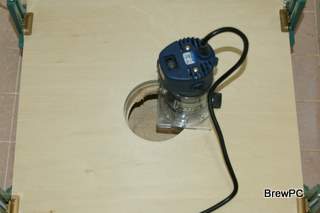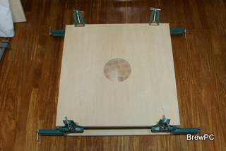 正確に加工するためにトリマ用に15mmのシナベニアでテンプレートと台座を製作しました。テンプレートはスピーカユニット取り付け穴用(107φ)と落とし込み穴用(132φ)の2種類で、台座とはコーナ・クランプを使いお互いに結合し半球をがっちり挟んで固定して加工に備えます。