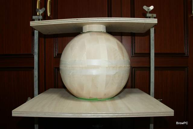 スピーカユニット取り付けから出た端材を、接着時と球体を一時的に置く台座として活用します。