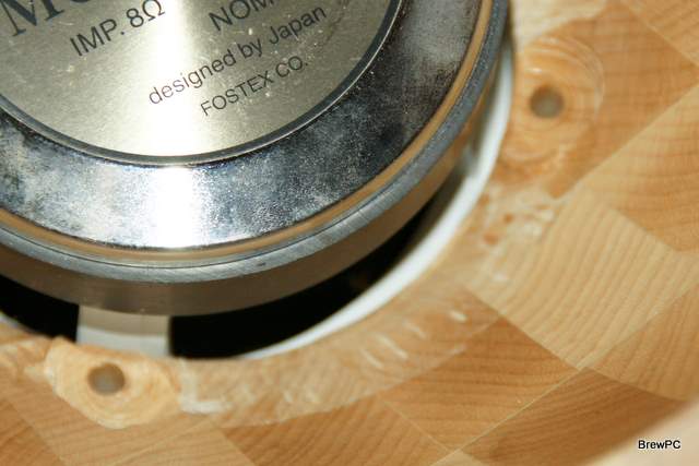 強固な構造を狙って板厚は25mmです。このままスピーカ・ユニットを取り付けるとダイアフラム裏面のエアフローを妨げ、干渉で中域の周波数特性が乱れます。フリーハンドでトリマを使いスピーカユニット取り付け穴の周辺を内部側で斜めにカットしています。これもスピーカ・エンクロージャ製作のノウハウのひとつで手は抜けません。