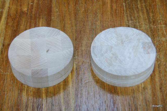 テンプレートと台座で半球を挟み込み→トリマでトップを平らに加工 |
