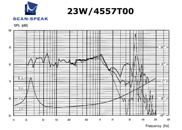 SCANSPEAKの23W/4557型サブウーファです。リニア・ダイアフラム振幅±13mm、最大ダイアフラム振幅±20mm、最低共振周波数20.5Hz、連続最大入力225Wとすごいスペックです。