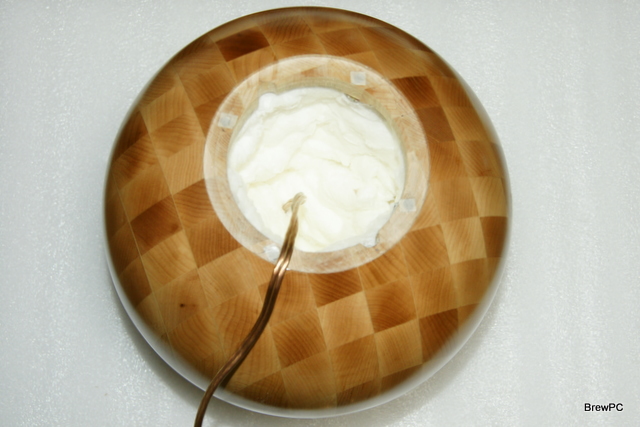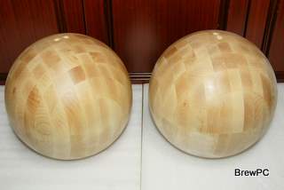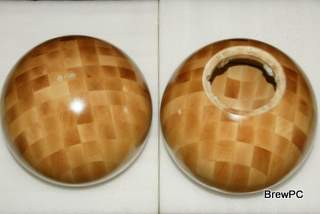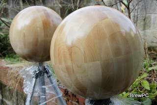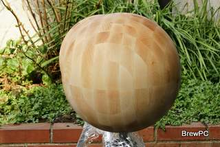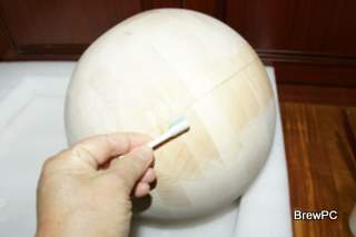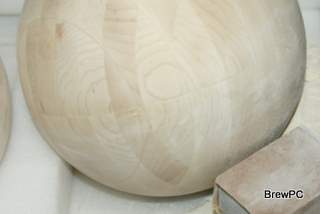 半球のつなぎ目のわずかな段差は240番サンド・ペーパーで完璧になくしています。つなぎ目の溝に入った木屑をたんねんに掃除して「との粉」で目止めします。十分に乾かしてから400番のサンドペーパーで全体をたんねんに磨き上げ、固く絞ったタオルで水拭きして一晩かけて乾燥します。