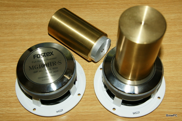 MG100HR-Sのダイアフラム等価質量5.4gに対してフレーム重量1.5kgと質量比は276倍ありますが、総重量2.5kgの真鍮デッドマスを2液性のエポキシ接着剤で接着し、総合で4kgと質量比740倍と振動支点の明確化と振動対策を行っています。これによって演奏中にエンクロージャを手で触ってもかすかな振動しか感じなくなります。