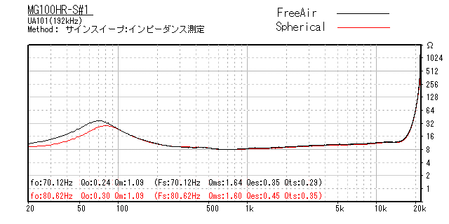 最低共振周波数は70Hz⇒80Hzに上昇し、極大点のインピーダンスが下がっています。これは逆起電圧が減少すること、すなわちダイアフラムの共振が制御されたことを意味します。