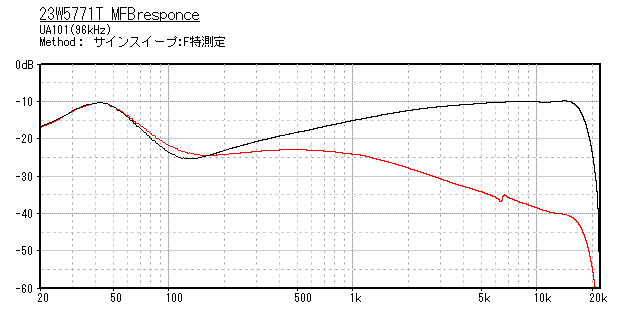 MFBドライブ設計の基礎データにするため、ブリッジ検出回路を作り変えてモーショナル信号を観測してみました。黒のソリッドラインはエンクロージャに収めたままを、赤のソリッドラインは高域の固有インダクタンスをキャンセルしたモーショナル信号の周波数特性です。