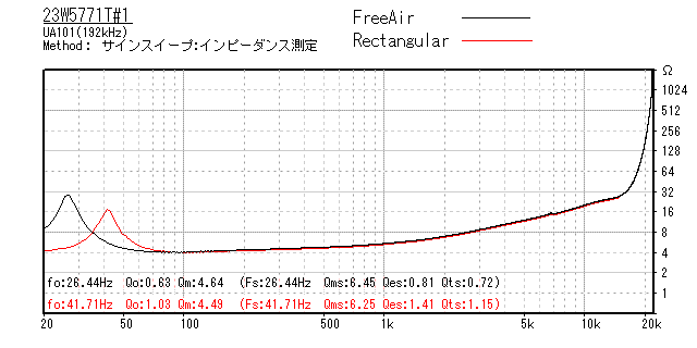 最低共振周波数は26Hz⇒42Hzに上昇し、極大点のインピーダンスが下がっています。これは逆起電圧が減少すること、十分ではありませんがダイアフラムの共振が制御されたことを意味します。