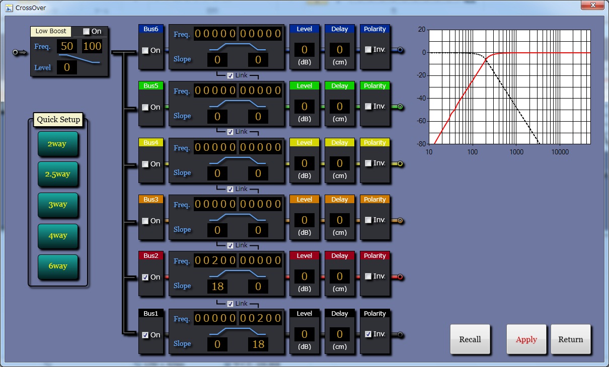 マウス操作でBUS1、BUS2にチェックをいれて、クロスオーバーを200Hz、-18dB/octに設定 |
