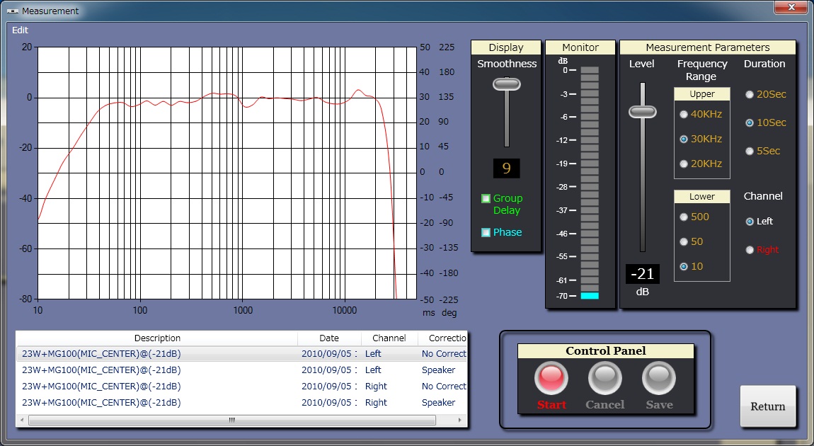 スピーカから40cmの距離における補正前の実周波数特性だ。精密なユニットの落とし込み加工で40Hzから20kHzを超える広い帯域でフラットといえる極上の特性 なのだが、SSCで補正した音と比べると不十分であったと分かる。