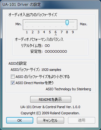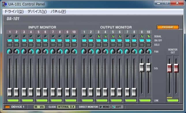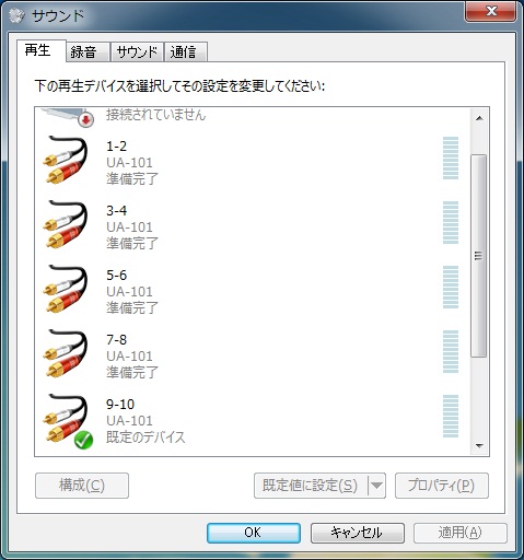 Win7/Vistaのコントロールパネルから再生デバイスはUA101のch9/10を選び、UA101コントロールパネル設定はch9/10のoutputフェーダを0dBとしている。