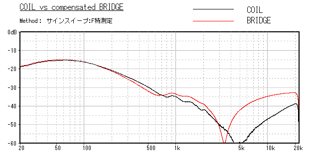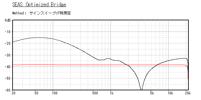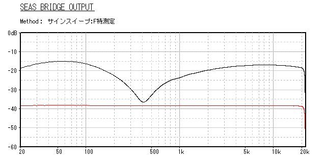 ブリッジ検出回路の入力が赤の実線で、出力が黒の実線だ。最低共振周波数の形状が異なり、 モーショナル信号としては400Hz程度までといえる。サブウーファがせいぜいなんて言われちゃう理由だ。
