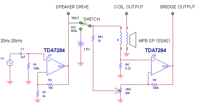 従来のブリッジ式は測定はSWITCHをTESTに倒して印加信号をSPEAKER DRIVE端子からブリッジ式モーショナル信号をBRIDGE OUTPUTからそれぞれ測定する