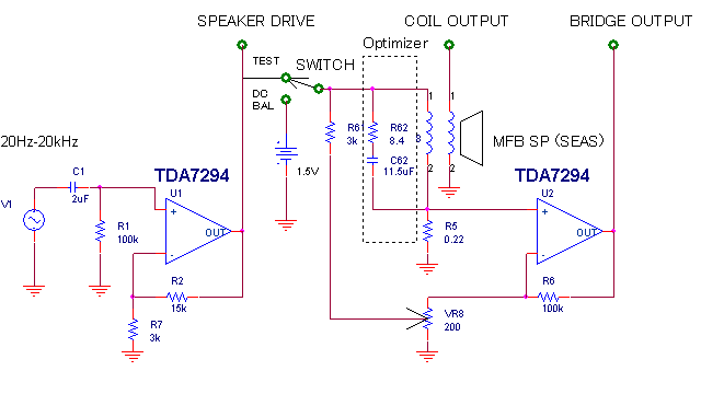 チカマ式と従来のブリッジ式、オプティマイズド・ブリッジ式のそれぞれのモーショナル信号比較に実験回路を作成した。ブリッジ式の調整は、SWITCHをDC BAL側に倒してBRIDGE OUTPUTの端子をオシロスコープを見ながら0VになるようにVR8を調節する。