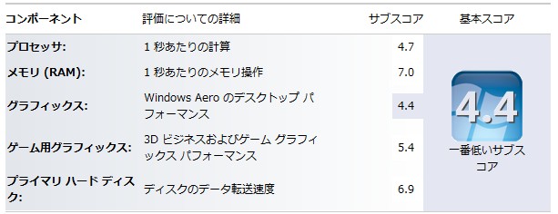 お約束のパフォーマンスチェック、Windowsエクスペリエンス・インデックス・サブスコアは一番低いグラフィックスでも4.4と なかなか良い値だ♪。