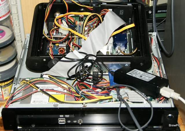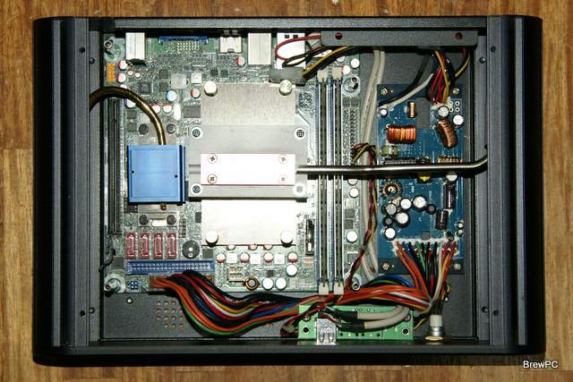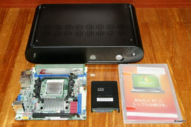 SSCの環境として十分なパフォーマンスが予備実験で確認できたTDP25WのCPU、Athlon x2 260u 1.8GHz、RAMにDDR3 1333 2GBx2、3.5インチHDDで構成したシステム消費電力はアイドリングで40W、ベンチマークで54Wだった。これらをヒートパイプ・メインフレームに組み込みHDDをSSDに換装 することで無音のファンレス ・パソコンに仕立てる。