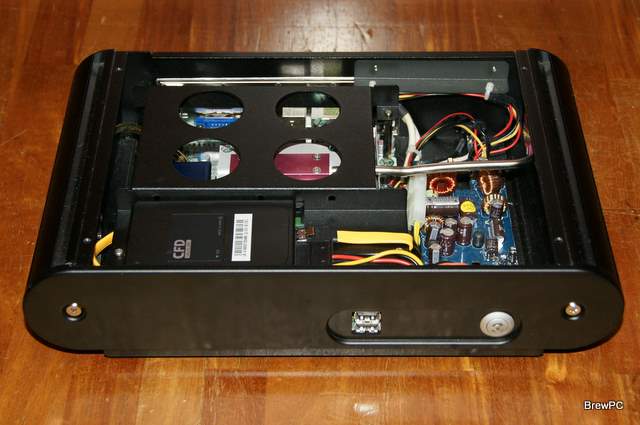 長期信頼性のTRIMや高性能なNCQをサポートしているCFDのCSSD-SM128WJ3型128GB、SSDをチョイスした。128GBの内訳は30GBをシステムに、残り98GBをMusicデータ用 にパーティションした。メディア・マウンタへの取付やケーブル・ドレスも施して内部のエアーフローを確保している。