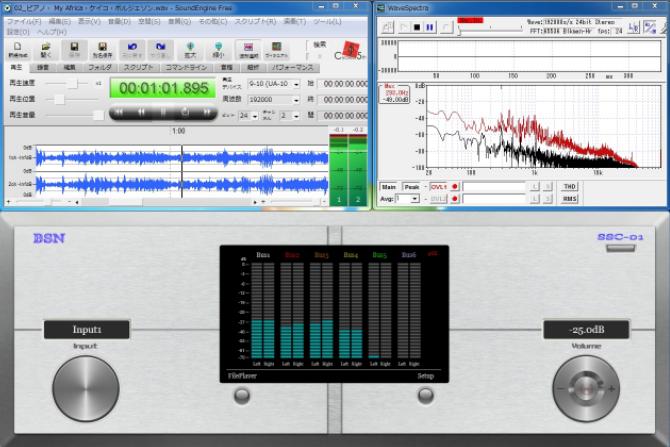 SoundEngineFreeで192kHz非圧縮音楽データを再生96kHzにリアルタイムに変換してSSCで12chにフル・プロセスしながらWaveSpectraでリアルタイムにFFT分析と想定される以上に重い動作をさせ たがCPU使用率は85%と合格圏内だ。