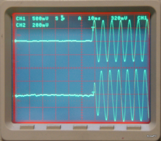 最低共振周波数のサイン波をオンにした瞬間のスピーカからの出力 (サイン波ステップ応答)波形だ。上(ch1)がアンプの入力信号、下(ch2)がマイクアンプからの出力信号だ。