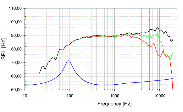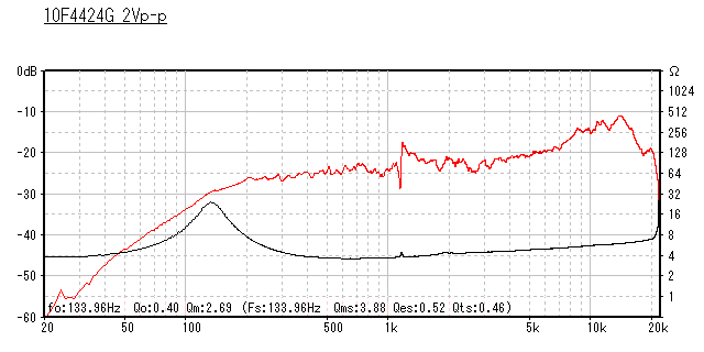 有効径: 68mmφ 公称インピーダンス: 4Ω 最小インピーダンス: 3.8Ω 最大入力電力: 30W 最大インピーダンス: 31Ω 直流インピーダンス: 3.2Ω ボイスコイル・インダクタンス; 0.1 mH 最低共振数端数: 90 Hz Qts: 0.3 Xcur (lin/max): 2.6 mm/7.0 mm ダイアフラム等価質量: 2.8g 重量: 0.3 Kg 能率: 89.76 dB (2.83V/1m) Vas: 2.06 リッタ |