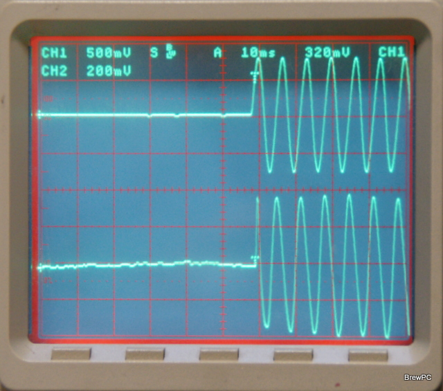 上(ch1)がイコライザ補正オプティマイズド・ブリッジTMMFBアンプ出力でスピーカユニットの端子電圧波形、下(ch2)がスピーカ音圧波形だ。イコライザのカットオフ特性によりベースラインに変動があるがアナログ特性としては これ以上無いと言える良い特性だ。細かな違いは残るがトランジェントが改善され、スピーカの音圧波形が入力の音楽信号と同じなる。