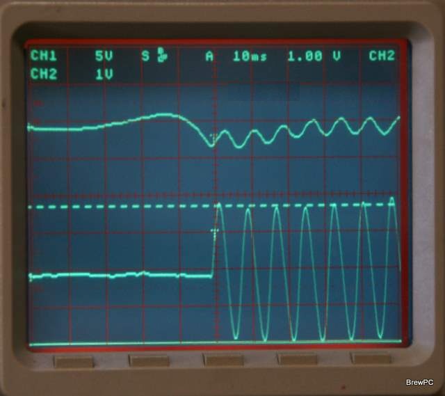 10F4424Gの最低共振周波数126Hzにおけるサイン波ステップ応答だ。上(ch1)が入力 電圧波形、下(ch2)がスピーカ音圧波形だ。ダイアフラム応答が改善され第1波目の最初のスイングで定常振幅に達する。90°進む位相からも速度型特性と分かる。