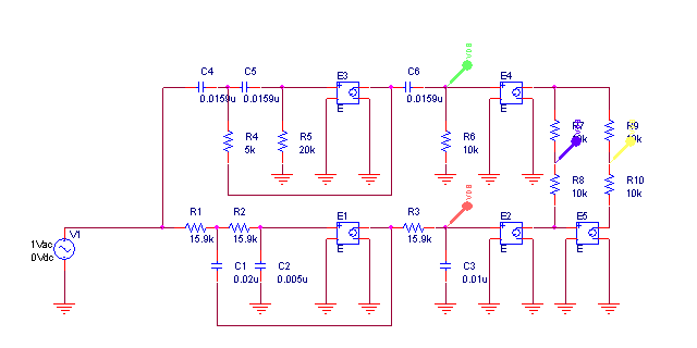 音が良いとされる-6dB/octネットワークです。伝送特性をシミュレーションでさっくりとレビューしてみます。クロスオーバ周波数は1kHz、赤VDBが低域出力、緑VDBが高域出力、青VDBが正相合成、黄VDBが逆相合成です。振幅特性でわかるように合成の振幅特性は正相、逆相どちらもフラットですが、位相特性に示されるように逆相では位相特性が大きく変化(回転)しています。(VDB以下略)