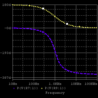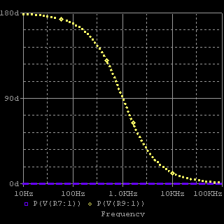 -18dB/octのネットワークです。青が同相合成、黄色が逆相合成です。合成の振幅特性はどちらもフラットですが、位相特性は同相、逆相とも大きく変化しています。