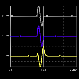 楽器のアタックに相当する1kHzの単発サイン波のシミュレーションです。グレーが入力信号、同相合成が青、逆相合成が黄色です。入力信号の品質が保たれるのは青色の同相のカーブで、黄色の逆相は応答が異なります。