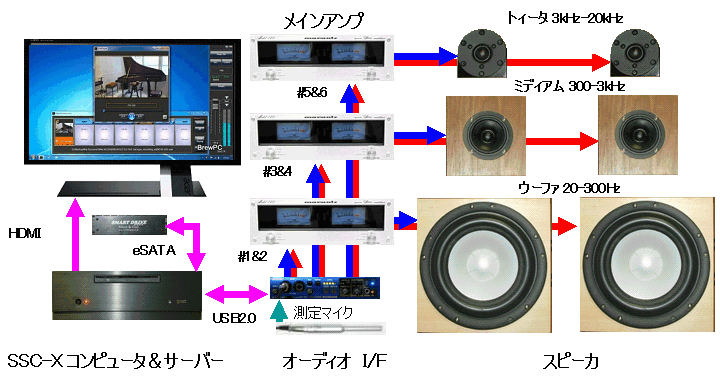 マルチ・チャンネル ・システムでは難しかったオーディオの原点と言える音楽信号をプロポーショナルに音響信号に変換する3chデモンストレーション・システムです。 ストレージ・メディアに格納されたスタジオ品質のハイサンプリング音源データを、最新のSSC-X/Xeonプロセッサ無音コンピュータでプロセス、オーディオI/Fでマルチ・スピーカ・モジュールのメインアンプをダイレクトにドライブする構成です。