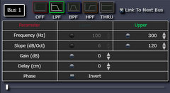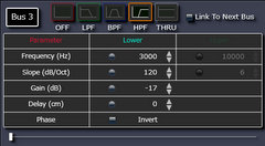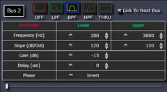 BUS1:ウーファをLPFに、BUS2:ミディアムをBPF、BUS3:トィータをHPFに変更しクロスオーバ周波数、スロープ、ゲイン(レベル) の各項目を設定後、振幅特性結果のフェーズカーブがクロスオーバ周波数で連続するようにそれぞれの極性を合わせます。