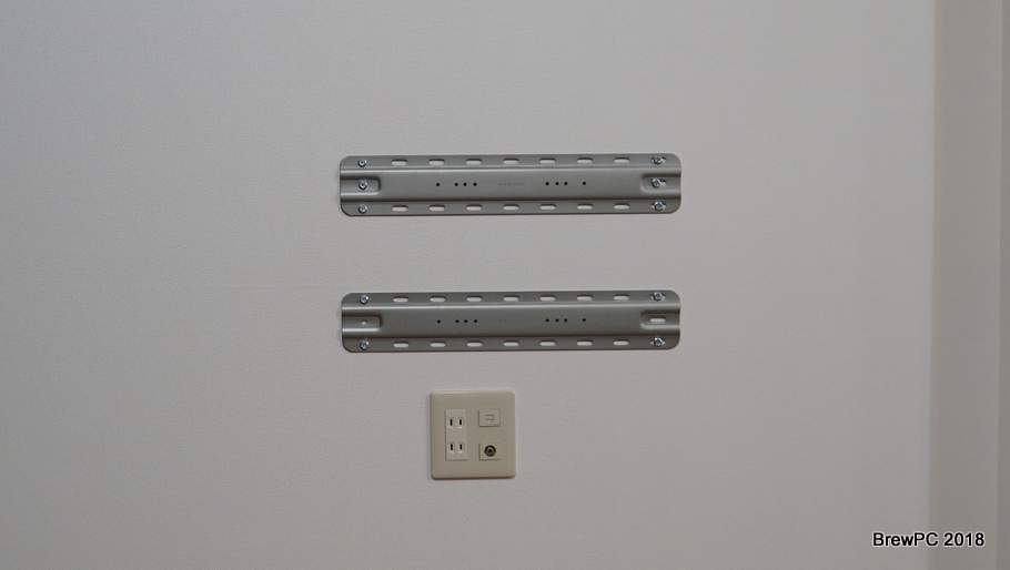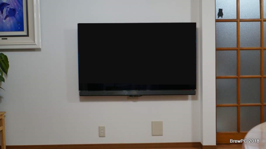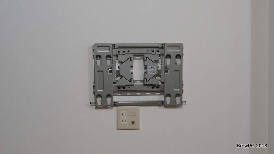 リビング・ルームに壁掛け設置した.対象壁面は針葉樹12mm厚べニア2重構造で電源コンセントや有線LAN/アンテナ・コネクタなどを設えてある.4mmΦのドリル下穴に76mmセルフ・タップ・スクリュで